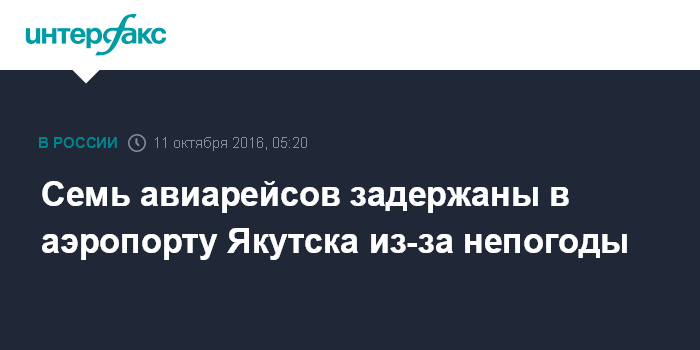 "Сегодня задержаны семь авиарейсов, которые должны были вылететь в северные поселки Тикси, Черский, Депутатский, Белая-Гора. Причиной являются обледенение взлетно-посадочных полос, низкая облачность, осадки, сильный ветер в принимающих поселках", - сообщила пресс-секретарь.
