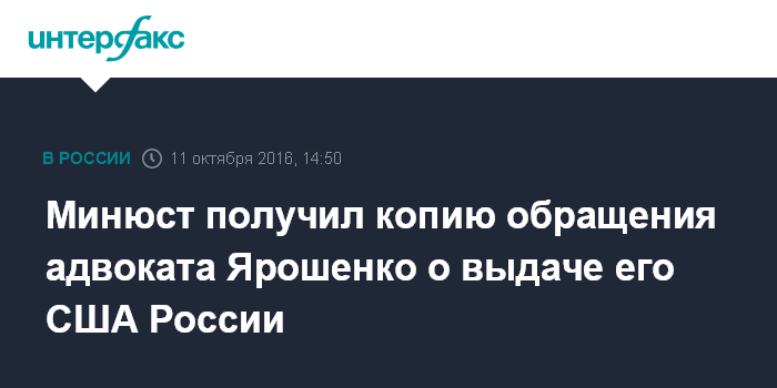 Минюст получил копию обращения адвоката Ярошенко о выдаче его США России