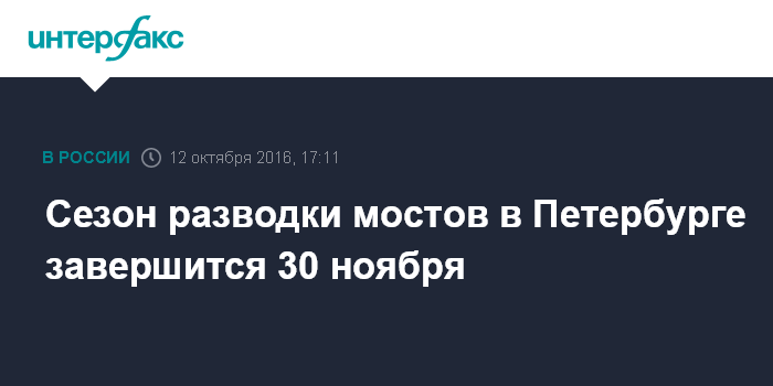 Москва. 12 октября. INTERFAX.RU - Разводка мостов в Санкт-Петербурге завершится 30 ноября, на следующий день официально завершится сезон навигации, сообщает в среду туристический портал северной столицы.