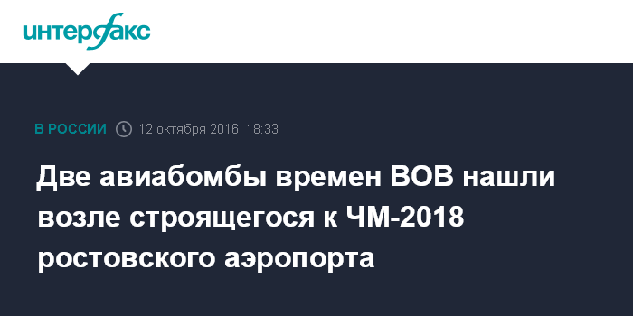 Москва. 12 октября. INTERFAX.RU - Две неразорвавшиеся бомбы времен Великой Отечественной войны нашли энергетики во время прокладки кабеля неподалеку от аэропорта, строящегося в Ростовской области к Чемпионату мира по футболу 2018 года.
