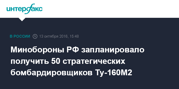 Москва. 13 октября. INTERFAX.RU - Минобороны рассчитывает параллельно с разработкой перспективного авиационного комплекса Дальней авиации получить от промышленности несколько десятков стратегических бомбардировщиков Ту-160М2, сообщил заместитель министра обороны РФ Юрий Борисов.