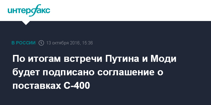 Москва. 13 октября. INTERFAX.RU - Соглашение о поставках зенитных ракетных систем С-400 "Триумф" будет подписано, как ожидается, в субботу на Гоа по итогам встречи президента РФ Владимира Путина и премьера Индии Нарендры Моди, заявляют в Кремле.