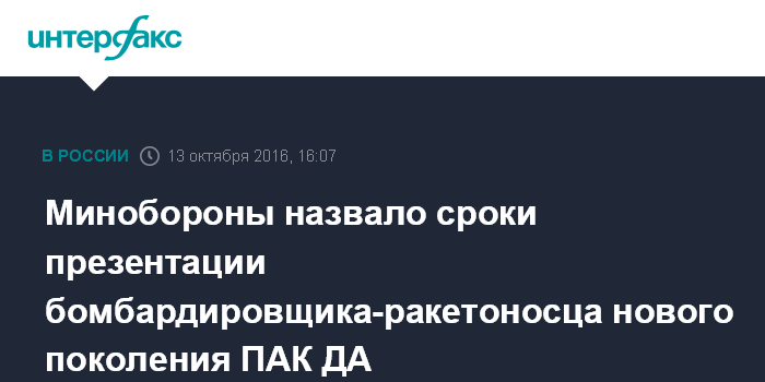 Москва. 13 октября. INTERFAX.RU - Перспективный авиационный комплекс дальней авиации (ПАК ДА) может быть представлен публике уже в 2018 году, сообщил замминистра обороны РФ Юрий Борисов.