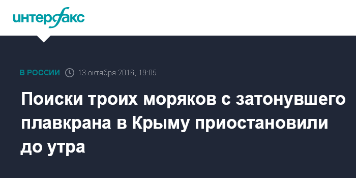 Москва. 13 октября. INTERFAX.RU - Операция по поиску троих моряков с затонувшего у берегов Крыма плавкрана приостановлена до утра пятницы из-за наступления ночи, сообщила пресс-служба крымского управления МЧС.