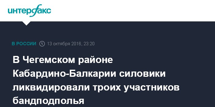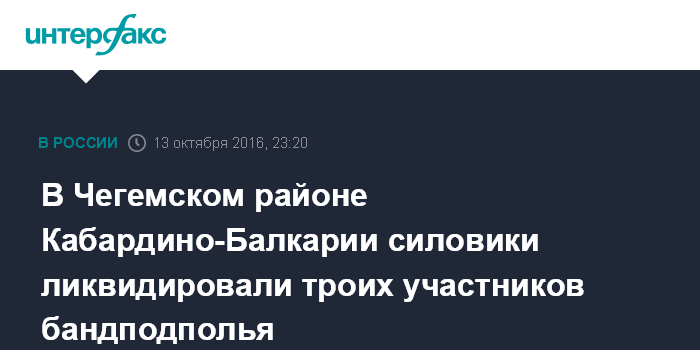 Москва. 13 октября. INTERFAX.RU - Трое боевиков по предварительным данным уничтожены в Чегемском районе Кабардино-Балкарии, сообщил "Интерфаксу" в четверг источник в силовых структурах региона.