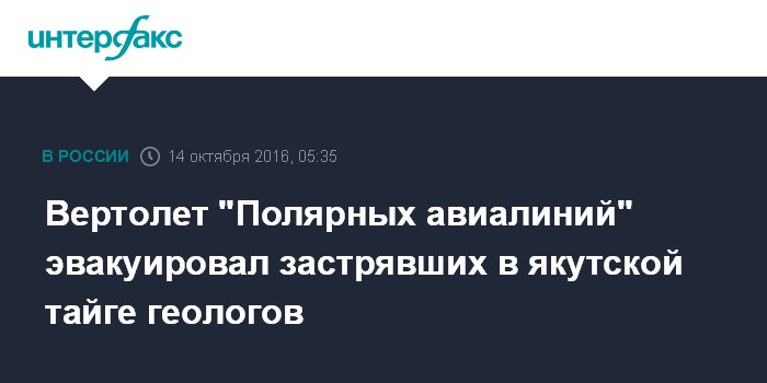 Москва. 14 октября. INTERFAX.RU - Эвакуацией порядка 60 геологов с места полевых работ в тайге Усть-Янского района Якутии занимается вертолет авиакомпании "Полярные авиалинии".