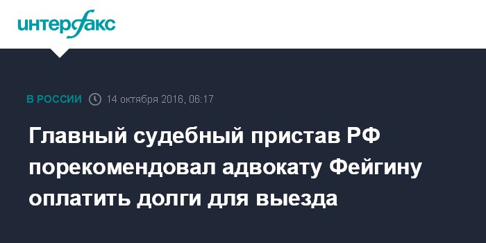 Ранее Фейгин сообщил "Интерфаксу", что ему запрещено выезжать из России по решению судебного пристава. Вместе с тем адвокат отметил, что у ФССП есть извещение о погашении всех его задолженностей.