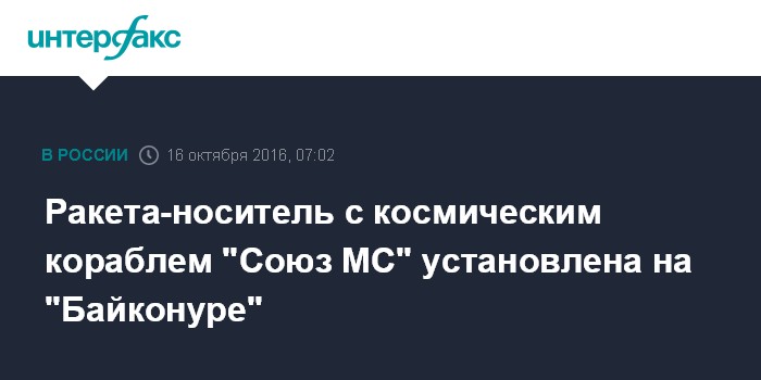 Москва. 16 октября. INTERFAX.RU - Ракета-носитель "Союз-ФГ" с космическим кораблем "Союз МС-02", которому предстоит в среду, 19 октября, отправиться к Международной космической станции (МКС), установлена на стартовом комплексе космодрома "Байконур".