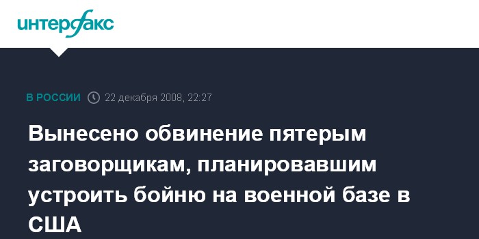 Вашингтон. 22 декабря. ИНТЕРФАКС - Пять человек признаны в понедельник американским правосудием виновными в организации заговора с целью убийства солдат на военной базе Форт-Дикс (штат Нью-Джерси, США), сообщает американский телеканал Си-Эн-Эн.