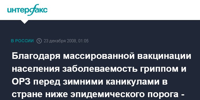 Благодаря массированной вакцинации населения заболеваемость гриппом и ОРЗ перед зимними каникулами в стране ниже эпидемического порога - Онищенко