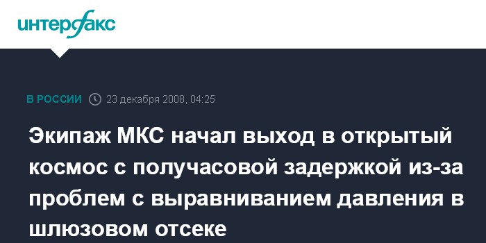 Экипаж МКС начал выход в открытый космос с получасовой задержкой из-за проблем с выравниванием давления в шлюзовом отсеке