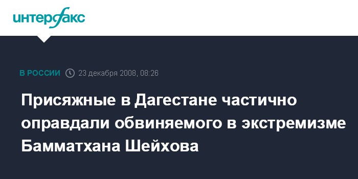 Москва. 23 декабря. INTERFAX.RU - В Верховном суде Дагестана коллегия присяжных вынесла оправдательный вердикт по двум из четырех статей, предъявленных жителю республики Бамматхану Шейхову, которые правоохранительные органы считают идеологическим лидером дагестанских религиозных экстремистов.