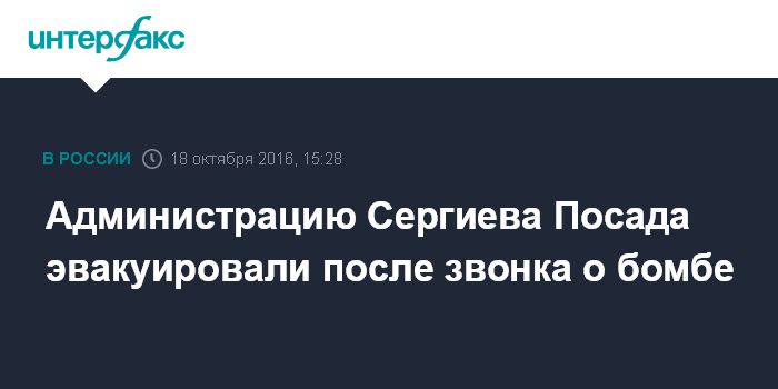 По его словам, в полицию поступил анонимный звонок о том, что в здании администрации в городе Сергиев Посад заложено взрывное устройство. "Проводится эвакуация здания", - сказал собеседник агентства.