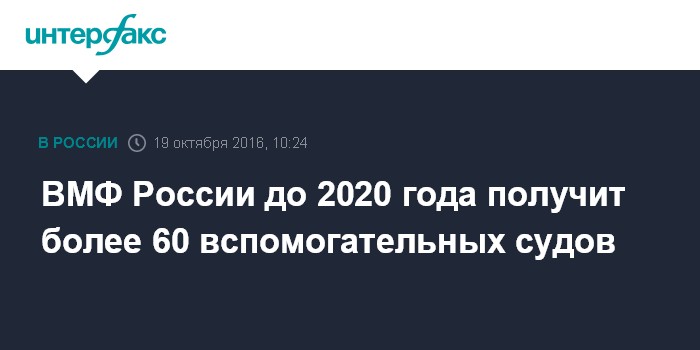Москва. 19 октября. INTERFAX.RU - Четыре флота ВМФ России до 2020 года получат 61 новое вспомогательное судно, сообщил в среду журналистам замминистра обороны РФ, генерал армии Дмитрий Булгаков.
