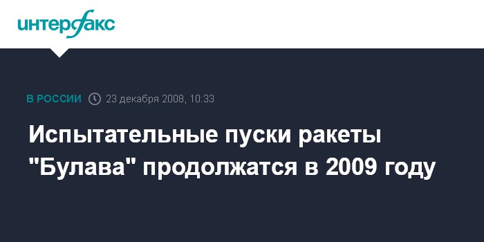 Москва. 23 декабря. INTERFAX.RU - Испытания межконтинентальной баллистической ракеты морского базирования "Булава" будут продолжены в 2009 году, сообщили "Интерфаксу-АВН" в российском военном ведомстве.