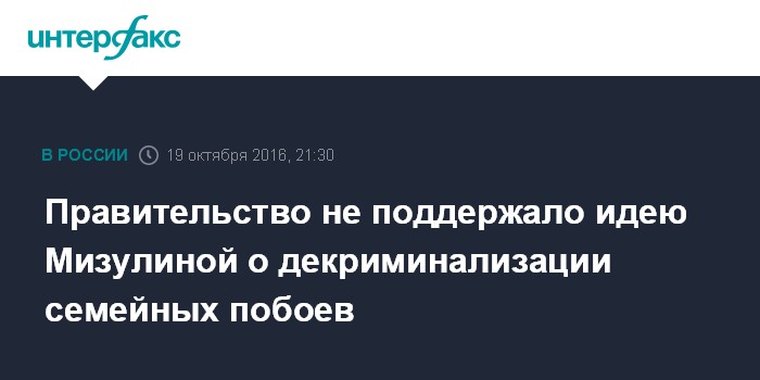 Москва. 19 октября. INTERFAX.RU - Правительственная комиссия по законопроектной деятельности не поддержала законопроект члена Совета Федерации Елены Мизулиной о декриминализации семейных побоев, сообщает сайт газеты "Ведомости". В июле она внесла в Госдуму законопроект, переводящий из сферы уголовной ответственности в административную семейные побои без вреда здоровью.