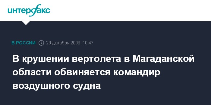 Москва. 23 декабря. INTERFAX.RU - Следствие считает командира вертолета Ми-8 виновным в аварии машины в Среднеканском районе Магаданской области в сентябре 2007 года, в результате которого погибли шесть человек.