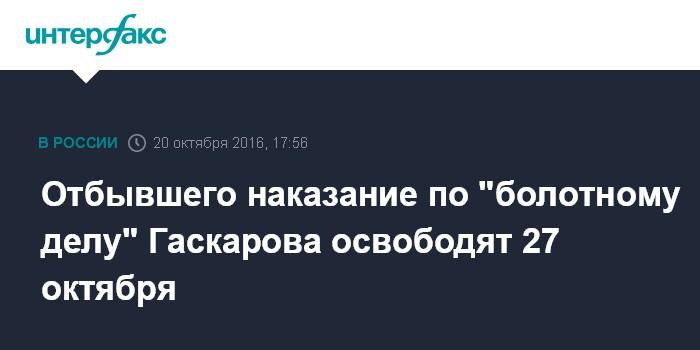Москва. 20 октября. INTERFAX.RU - Оппозиционер Алексей Гаскаров, осужденный на 3,5 года колонии по делу о массовых беспорядках на Болотной площади 6 мая 2012 года через неделю выходит на свободу, сообщила в четверг его защита.