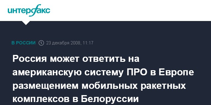 "Если США продолжат приближать к границам России элементы своих стратегических сил, в частности, объекты ПРО в Польше и Чехии, направленные на снижение нашего ядерного потенциала, то в Белоруссии могли бы быть размещены мобильные комплексы "Тополь". Полагаю, что уровень стратегического партнерства Союзного государства России и Белоруссии позволит решить этот вопрос положительно", - сказал собеседник агентства.