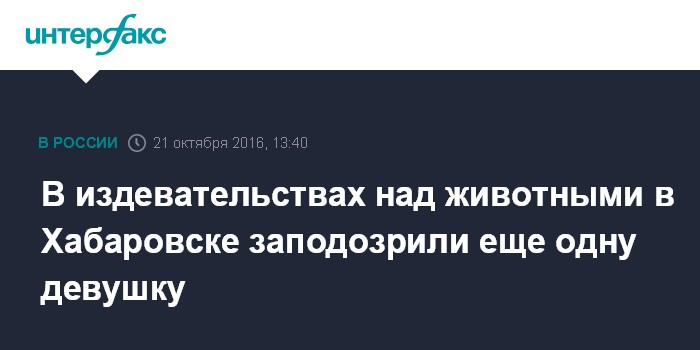Ранее стало известно, что в отношении одной из подозреваемых в издевательствах над животными возбуждено уголовное дело по статье УК РФ "Жестокое обращение с животными". Девушка пыталась скрыться, вылетев из Хабаровска в Санкт-Петербург, ее сняли с рейса во время пересадки в аэропорту Новосибирска.