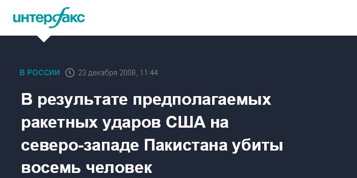 Москва. 23 декабря. INTERFAX.RU - Восемь человек погибли в результате предполагаемых ракетных ударов США на северо-западе Пакистана, сообщает во вторник интернет-сайт индийской газеты Times of India. По данным газеты, личности жертв двух ударов, нанесенных по пакистанской территории накануне, на настоящий момент не установлены.