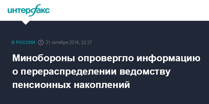 Москва. 21 октября. INTERFAX.RU - В Минобороны России опровергли сообщения некоторых СМИ о том, что замороженные пенсионные накопления россиян якобы планируется направить в распоряжение военного ведомства.
