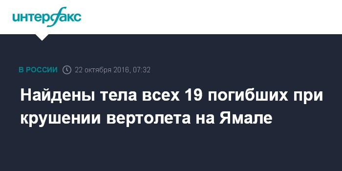 Москва. 22 октября. INTERFAX.RU - Спасатели обнаружили тела 19 погибших на месте падения вертолёта Ми-8 в Ямало-Ненецком автономном округе (ЯНАО), сообщает окружное ГУ МЧС России.