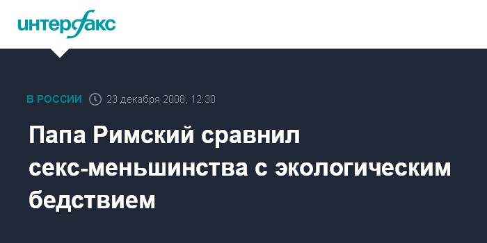 Москва. 23 декабря. INTERFAX.RU - Папа Римский Бенедикт XVI заявил, что спасение человечества от гомо- и транссексуализма так же важно, как и забота о сохранении тропических лесов.