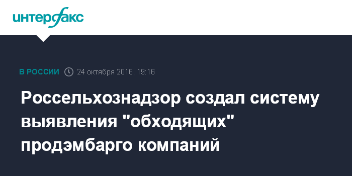 Москва. 24 октября. INTERFAX.RU - Россельхознадзор создал электронную систему для выявления компаний, которые обходят российское продуктовое эмбарго. Заявление об этом ведомство в понедельник опубликовало на своем сайте.