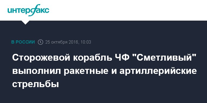 Москва. 25 октября. INTERFAX.RU - Сторожевой корабль (СКР) Черноморского флота (ЧФ) "Сметливый" в морском полигоне в акватории Черного моря выполнил зенитную ракетную стрельбу по имитатору воздушной цели, сообщил во вторник "Интерфаксу" представитель ЧФ капитан 1 ранга Вячеслав Трухачев.