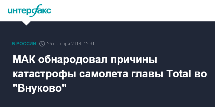 Москва. 25 октября. INTERFAX.RU - Комиссия Межгосударственного авиационного комитета установила причины катастрофы самолета "Фалькон", в которой погиб глава компании Total Кристоф де Маржери.