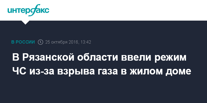 Москва. 25 октября. INTERFAX.RU - В Рязанской области объявлен режим чрезвычайной ситуации в связи со взрывом бытового газа в жилом доме в Рязани. Распоряжение об этом подписал губернатор Олег Ковалев, сообщает во вторник областное министерство печати.