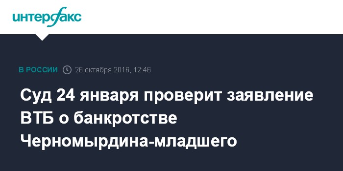 Москва. 26 октября. INTERFAX.RU - Арбитражный суд Москвы назначил на 24 января 2017 года заседание по проверке обоснованности заявления ВТБ о признании банкротом Виталия Черномырдина, сына знаменитого российского политического деятеля.