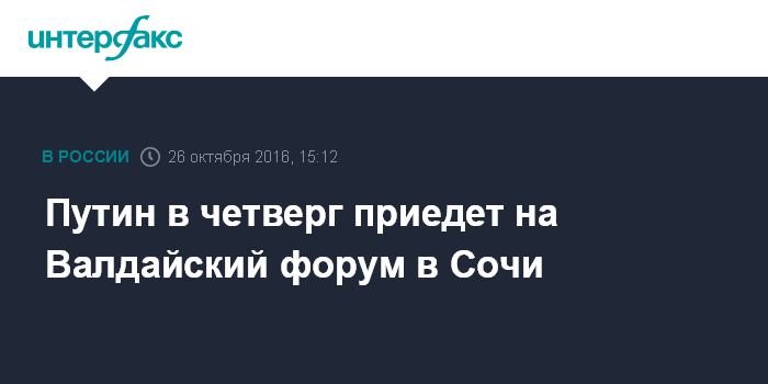 Москва. 26 октября. INTERFAX.RU - Президент России Владимир Путин в четверг, 27 октября примет участие в итоговой пленарной сессии XIII ежегодного заседания Международного дискуссионного клуба "Валдай", которое проходит в Сочи, сообщила пресс-служба Кремля.