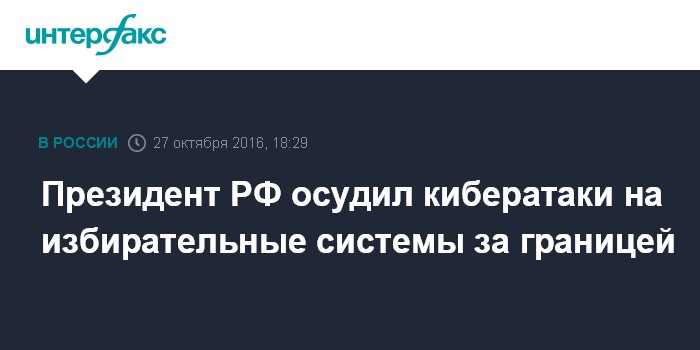 Москва. 27 октября. INTERFAX.RU - Вмешательство в избирательные процессы в других странах при помощи кибератак недопустимо, заявил президент РФ Владимир Путин.