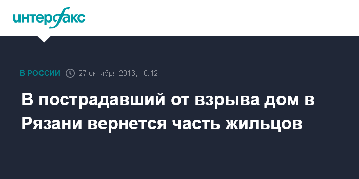 Москва. 27 октября. INTERFAX.RU - Во второй подъезд рязанской многоэтажки, пострадавшей от взрыва газа, в пятницу планируется вернуть жильцов. Об этом в четверг сообщил глава администрации города Олег Булеков.