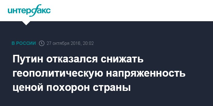 Москва. 27 октября. INTERFAX.RU - Снижения геополитической напряженности хотят все россияне, но только не ценой собственных похорон, сказал президент РФ Владимир Путин.