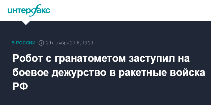 Москва. 29 октября. INTERFAX.RU - Стратегические ракетчики получили робота, который вооружен пулеметами и автоматическим гранатометом, сообщил начальник отдела боевой подготовки Ракетных войск стратегического назначения (РВСН) полковник Евгений Щелканов.