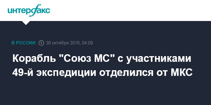 Москва. 30 октября. INTERFAX.RU - Космический корабль "Союз МС" отстыковался от Международной космической станции (МКС) и готовится взять курс на Землю.