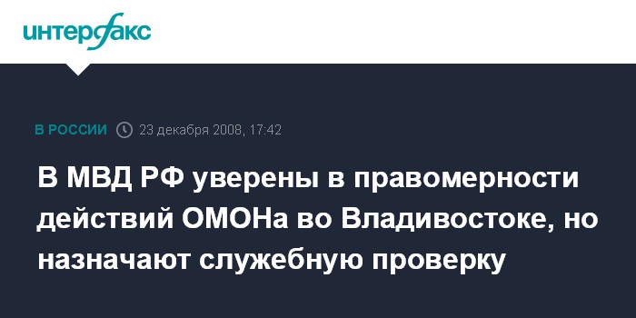 "Для объективного рассмотрения данного случая первым заместителем министра внутренних дел генерал-полковником милиции Михаилом Суходольским по факту действий сотрудников ОМОН во Владивостоке назначена служебная проверка", - говорится в сообщении, поступившем в "Интерфакс" во вторник. "МВД России не сомневается в законности действий своих сотрудников", - подчеркивается в документе.
