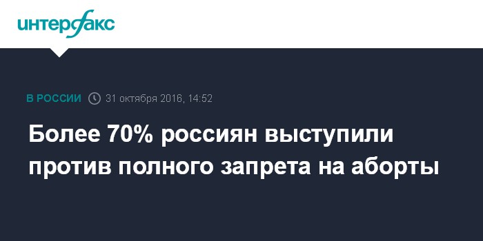 Москва. 31 октября. INTERFAX.RU - Большинство россиян не одобряют введение полного запрета на аборты и не поддерживают идею исключить их из системы обязательного медицинского страхования (ОМС), сообщает фонд "Общественное мнение".