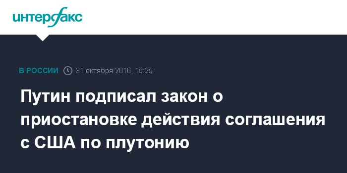 Москва. 31 октября. INTERFAX.RU - Президент РФ Владимир Путин подписал закон, которым приостанавливается действие соглашения между правительствами России и США об утилизации плутония.