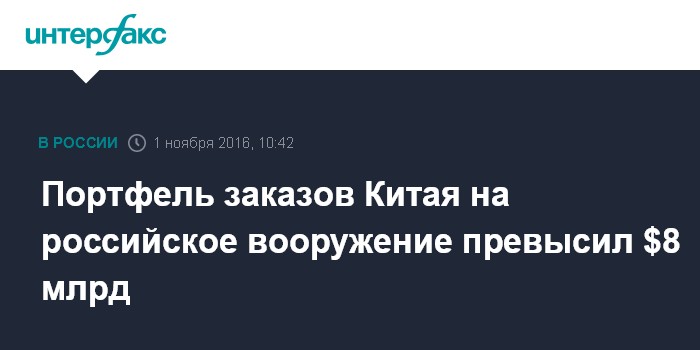 Москва. 1 ноября. INTERFAX.RU - Китай в ближайшие годы приобретет у России вооружение и военную технику более чем на $8 млрд, сообщил "Интерфаксу" во вторник заместитель директора Федеральной службы по военно-техническому сотрудничеству (ФСВТС) России Владимир Дрожжов.
