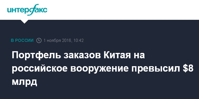 "Сегодня Китай входит в пятерку крупнейших покупателей российского вооружения и военной техники, а объем портфеля заказов этой страны в настоящее время превышает 8 млрд долларов США", - сказал он во вторник в ходе Международного аэрокосмического салона в Чжухае.