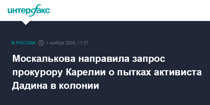 Москва. 1 ноября. INTERFAX.RU - Уполномоченный по правам человека в РФ Татьяна Москалькова взяла на личный контроль ситуацию c возможными пытками гражданского активиста Ильдара Дадина в карельской колонии.