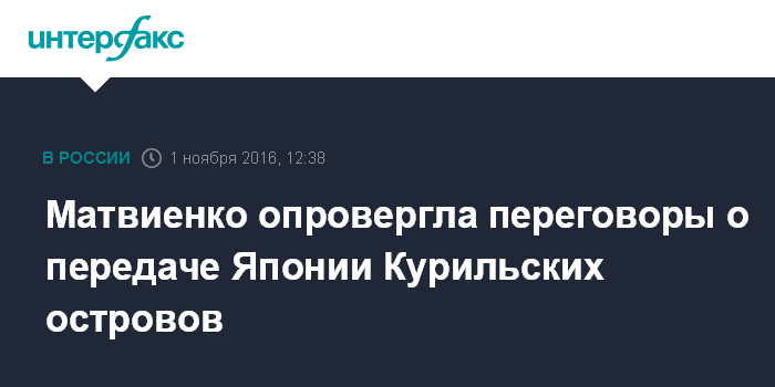 Москва. 1 ноября. INTERFAX.RU - Суверенитет России над Курильскими островами неоспорим и пересмотру не подлежит, переговоров об их передаче Японии нет, заявила председатель Совета Федерации Валентина Матвиенко.