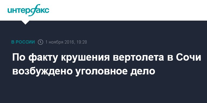 Москва. 1 ноября. INTERFAX.RU - Следователи возбудили уголовное дело по факту падения вертолета в Сочи, сообщили во вторник "Интерфаксу" в следственном управлении на транспорте СК РФ.