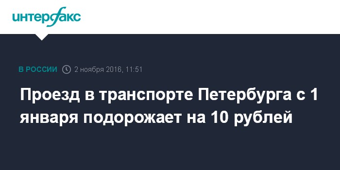 Москва. 2 ноября. INTERFAX.RU - Стоимость проезда в общественном транспорте Петербурга с 1 января 2017 года вырастет на 10 рублей, сообщил губернатор города Георгий Полтавченко, представляя проект бюджета города в Законодательном собрании в среду.