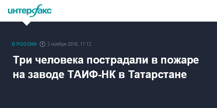 Москва. 2 ноября. INTERFAX.RU - Три человека госпитализированы с ожогами в результате пожара в цехе строящегося завода ТАИФ-НК в Нижнекамске (Татарстан), сообщила агентству "Интерфакс" руководитель пресс-службы Минздрава Татарстана Айгуль Салимзянова.