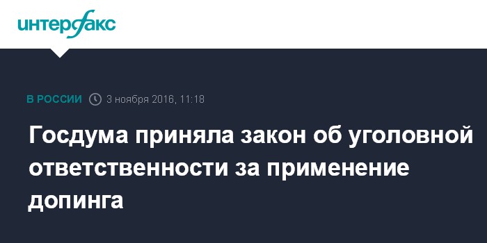 Москва. 3 ноября. INTERFAX.RU - Госдума в четверг приняла во втором и в третьем, окончательном, чтении закон, вводящий уголовное наказание за применение допинга в спорте.